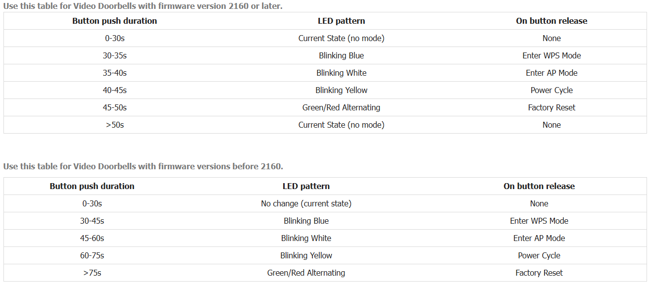 AP Mode (recommended) Verify that device boots (flashing red LED) to AP mode (flashing white LED). If the LED is not white after two minutes, hold down the doorbell button and release when the LED begins to blink white (about 35 seconds). On an ...