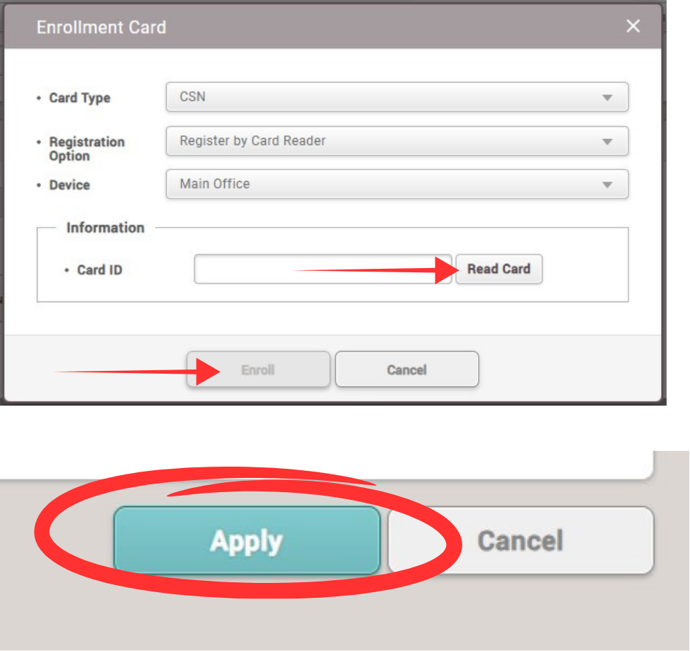 Select User Select Card for Vehicles the Card Type should be Wiegand Card Data Format will be 26 bit SIA Standard- H10301 for Registration Option, You will enter the code Manually, Select Enroll, and the Apply Take a look at the Vehicle Transponder ...